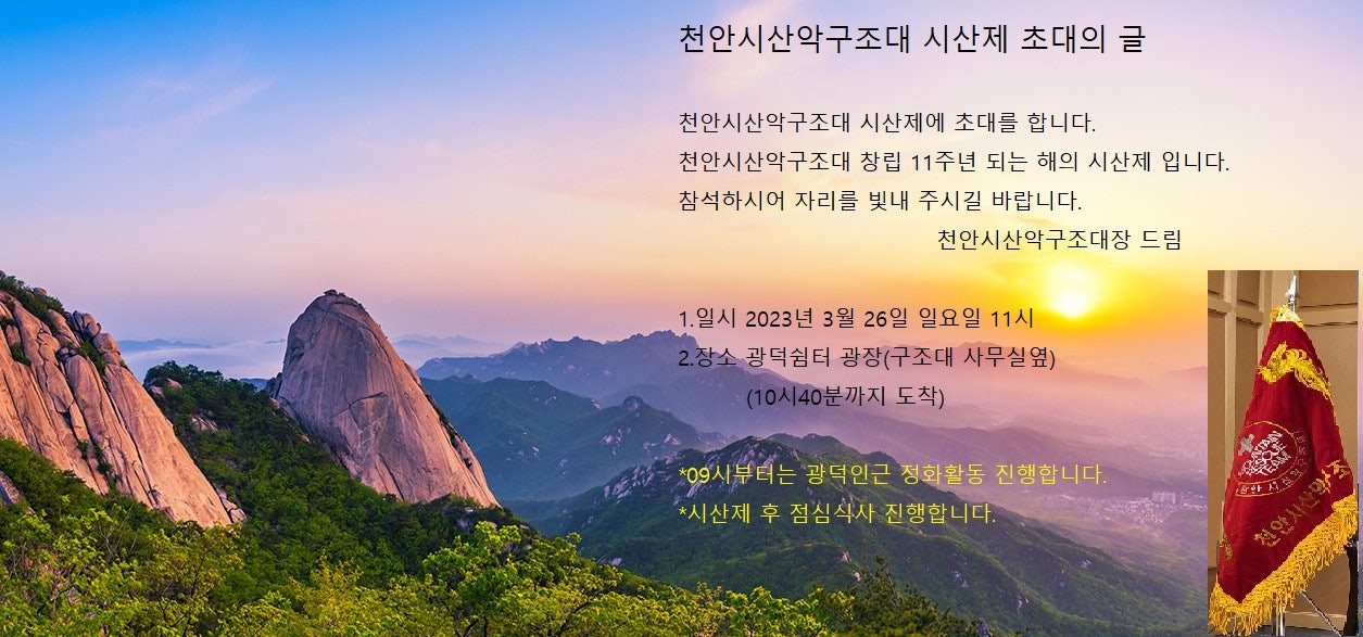 공지사항 제목시산제 재공지 및 숲사랑지도원증 신청강조2023-03-20 09:46작성자kskang시산제 재공지 및 숲사랑지도원증 신청강조이번주 일요일 천안시산악구조대의 제일 큰 행사인시산제가 진행됩니다.자문님,고문님, 운영위원님,대원님들께서는많은 참석을 바랍니다.아울러 슾사랑지도원증에 필요한 사진과 주민등록증(앞뒤카피본)을 꼭 지참하셔서 시산제때 신청해 주세요시산제 선물도 조그맣게 준비하였습니다.*주민등록증 카피가 어려우시면 사진 찍어서 저에게톡으로 보내주세요.제가 카 피해서 첨부하겠습니다.날이 좋아집니다. 봄 기운 완연한 좋은날에시산제가 이뤄지길 기원해 봅니다. 목록 댓글 [0] 더보기이전2023년 상반기 천안시산악구조대 명산등산 및 단합친목산행kskang2023-04-28다음천안시산악구조대 2월 월례회 공지 kskang2023-02-21 Powered by MangBoard