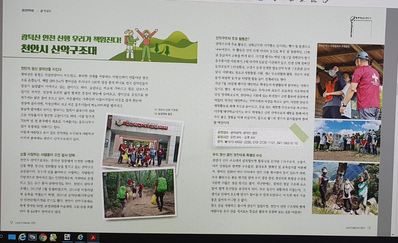 공지사항 제목천안시산악구조대가 천안사랑 소식지 9월호에 실렸습니다2021-10-11 13:53작성자kskang✌천안시산악구조대가 천안사랑 소식지 9월호에 실렸습니다. 눈 크게 뜨고 찾아 보세요~~^^ 목록 댓글 [0] 더보기이전학생 봉사시간 관련 공지kskang2021-10-11다음2021년 추석명절이 다가 왔습니다.kskang2021-10-11 Powered by MangBoard