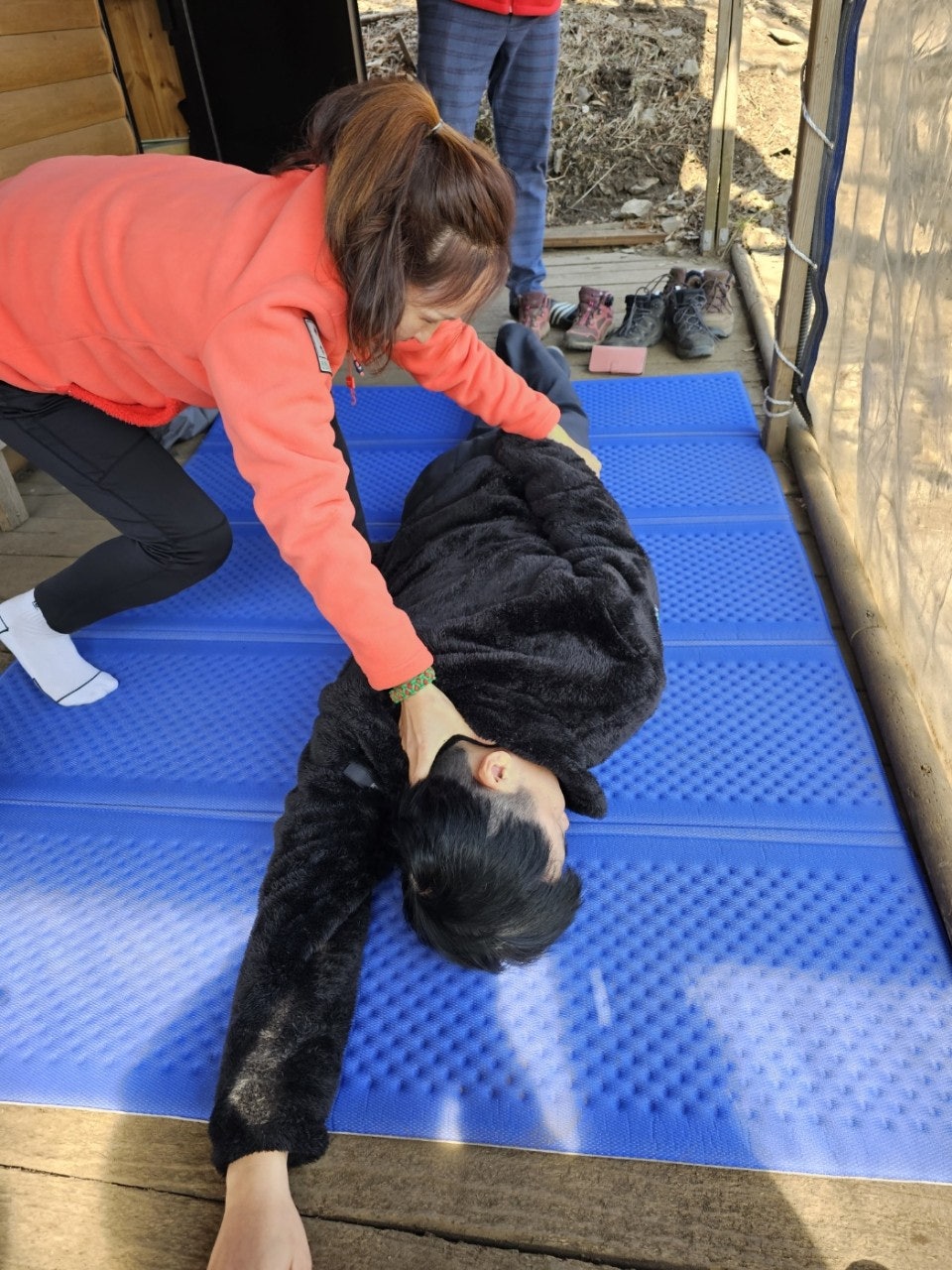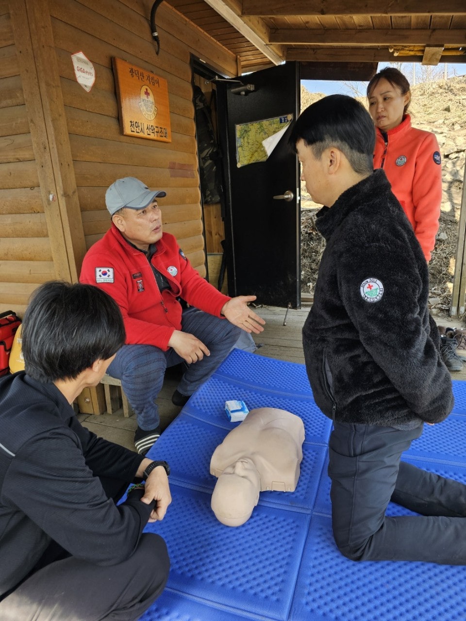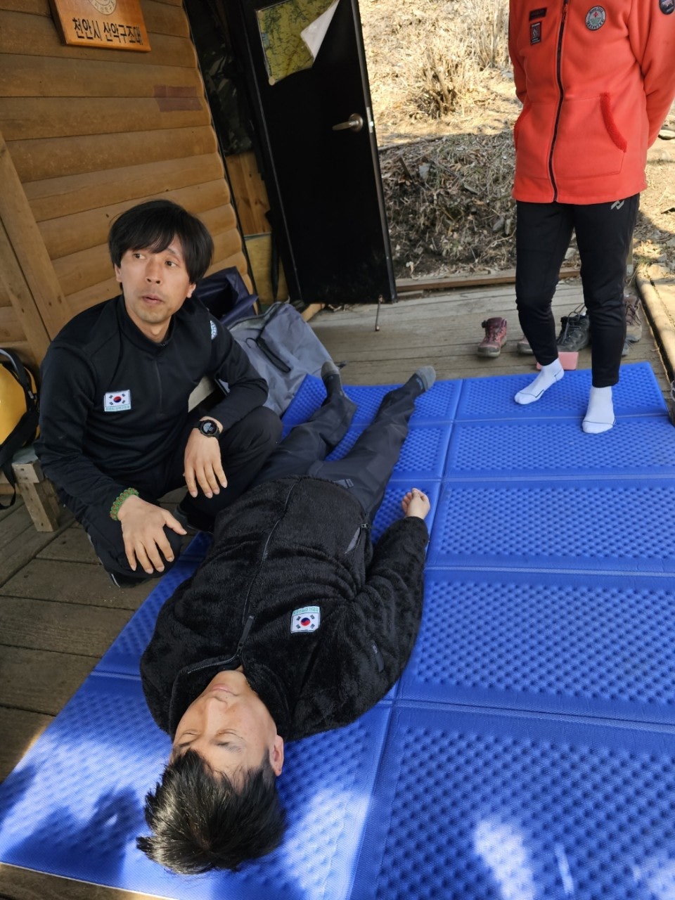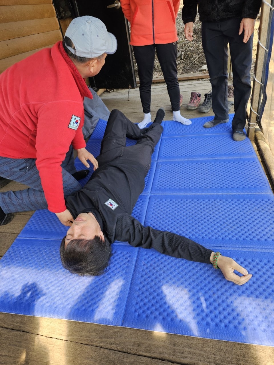 활동상황 제목# 2023.03.19(일) 근무일지2023-03-20 09:48작성자kskang# 2023.03.19(일) 근무일지■ 집결지 : 구조대 사무실, 광덕산■ 근무자 : 최성이 고문님이창덕 사무국장님박상숙 대원님(오래된 신입^^)고상배 대원님(최신 신입^^)진홍석 대원(저도 신입^^)■ 날씨 : 아주맑음■ 활동상황- 사무실 집결 후 119대응팀 보고- 광덕산 환경정화 활동오늘도 사무실앞에서 찰칵!오늘은 바로 광덕산 정상으로 향했습니다.신입이 3명(?)이어서 한방향으로 오르면서 정화활동에 집중했습니다.486계단 옆입니다.쓰레기가 많이 줄어들었음을 느낍니다.어느새 정자에 올랐습니다.정자 맞은편에서 쉬고 있으십니다.오랜만에 고문님과 산행중입니다.2월 구조대 활동중에 파손된 계단이 있었습니다. 오늘, 올라갈때 확인해보니,천안시에서 보수를 했습니다이렇게 보수했습니다.정상에 올라 점심먹기전에 고문님이 신입 3명에게 선물을 주셨습니다.짠!고문님 정말 감사합니다.한땀한땀 정성스럽게 만드셨습니다.점심을 먹은후 심폐소생술 교육이 있었습니다.저는 박용운 감사님, 최성이 고문님에게 1번씩 2번을 받았는데 다시 한번 하려니 머릿속이 하얘졌습니다.사람이 쓰러졌을때 바로 눕히는 방법에 대해 다시 한번 배웠습니다.경추를 꽉 잡아줘야합니다.다시 한번 고문님이 시범을 보여주셨습니다.신입 3명이 돌아가면서 교육을 받았습니다.다음은 심폐소생술!실전교육입니다여러상황에 맞춰 맞춤식 교육을 하고 저희가 궁금한 점에 대해 답변도 해주셨습니다.자세하게 한번 더 배웠습니다.재세동기도 각자 돌아가면서 배웠습니다.사람을 살리는 4분! 꼭 기억하겠습니다.한참 저희들 상대로 교육중에 광덕산에 오른 등산객부부께서 관심을 보이고 심폐소생술 궁금하다고해서 실습을 통해 알려드렸습니다제대로 실습중이십니다.실습 및 교육을하다보니 시간이 어느새 4시가 넘었습니다. 정리후 정상에 모여 다같이 사진을 찍었습니다.올라올땐 더운 여름이었는데 내려갈때는 바람도 차갑고 그랬습니다.<추가>정상 초소 태극기가 낡아 새것으로 교체하였습니다. 사무국장님과 고문님이 힘써주셨습니다.3월 3주차 산악구조대 근무 모두 고생많으셨습니다! 목록 댓글 [0] 더보기이전천안시안전총괄주체 안전점검의 날 캠페인kskang2023-03-20다음2월 5일 일요일 근무일지kskang2023-02-21 Powered by MangBoard