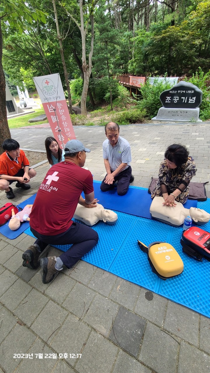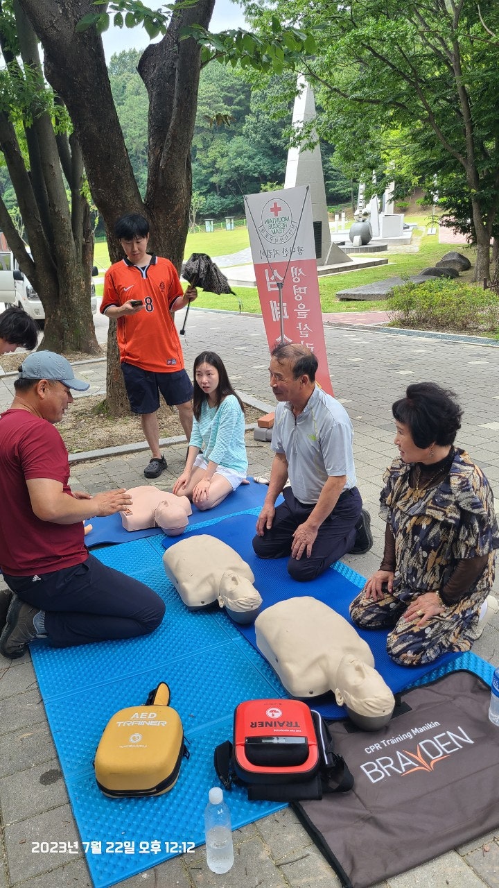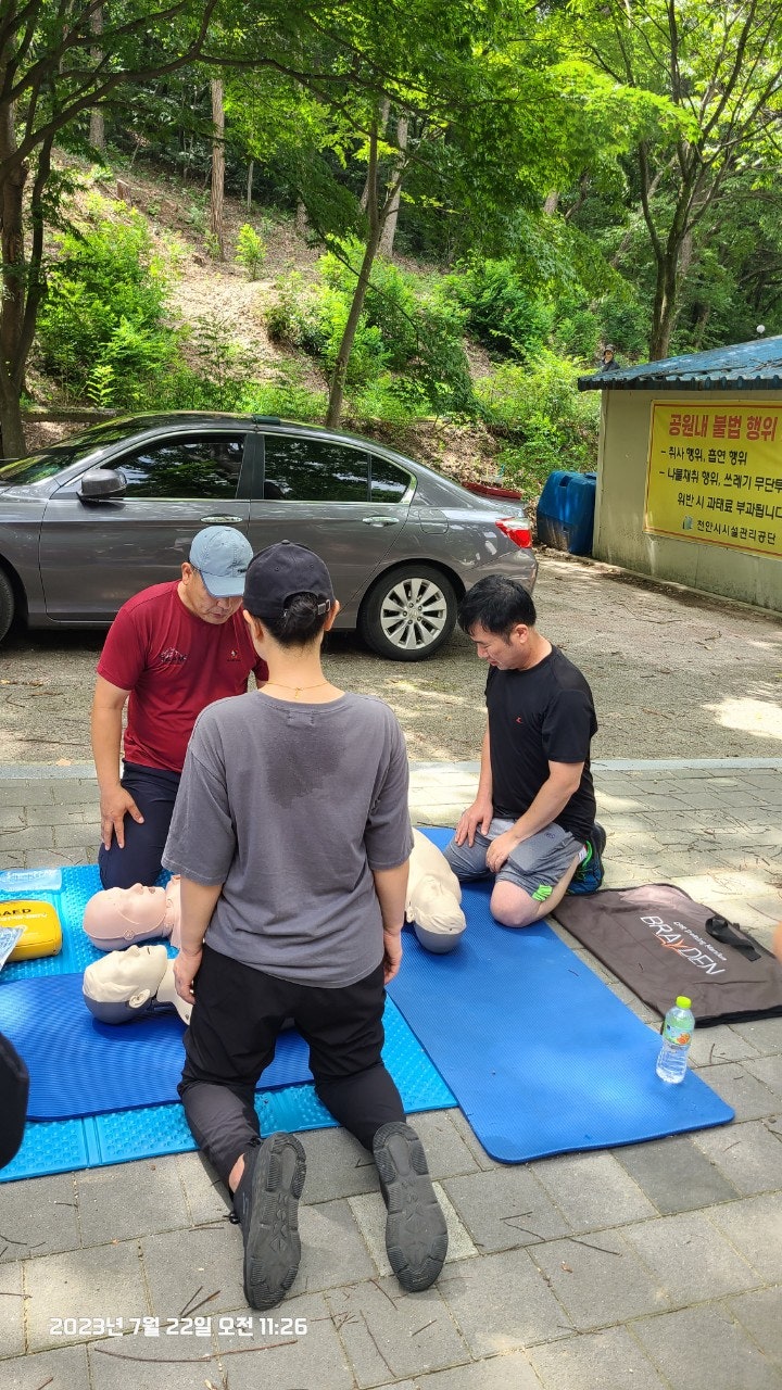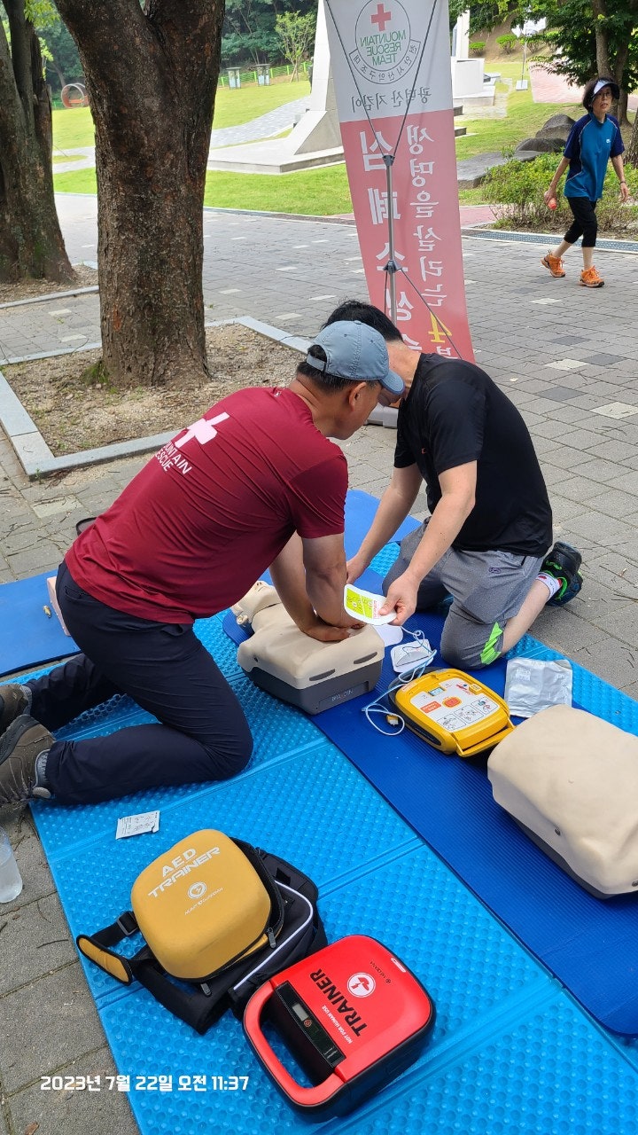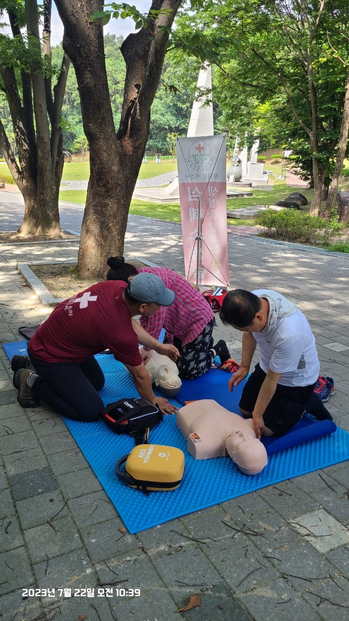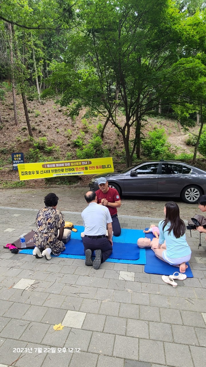 활동상황 제목토요일 태조산 응급처치 활동2023-07-23 08:31작성자kskang토요일 태조산 응급처치 활동날짜 : 2023년 7월 22일 토요일, 맑음시간 : 08시 00분 ~13시 00분참석자 : 최성이 고문님, 이연우 대원님, 고상배 대원님, 진홍석 대원-활동내용-☆태조산 정화활동- 태조산 안전체험관쪽으로 올라 태조산에 올라 형제봉을 지나 대머리봉으로 해서 정화활동했습니다.태조산 등산로에는 쓰레기가 없었으나 등산로를 벗어나 양옆으로 버려진 쓰레기가 많았습니다.대머리봉으로 가는길에 큰 나무가 쓰러졌습니다. 때마침 정자밑에 톱이 있어서 나무를 자르고 양옆으로 치웠습니다.태조산도 구조대가 접수했습니다^^☆심폐소생술 교육태조산 관리사무소 뒤편 그늘에 자리를 잡았습니다. 준비하자마자 노부부께서 관심을 보이셨습니다.진지한 모습으로 최성이 고문님 말씀을 듣고 계십니다.설명에 이어 실습중이십니다.'오늘 태조산에 오길 잘했다'하시면서 가셨습니다. 다음은 28개월 아이와 함께 온 부부였습니다. 토요일, 휴일이어서인지 가족단위로 많이 오셨습니다.이번에도 최성이 고문님이 담당하셨습니다.오늘 모든 교육 및 실습을 하셨습니다.아이와 함께와서 아이엄마가 교육을 받았습니다.실제처럼 연습하셨습니다.실습하면서 궁금한 사항을 물어보고 이해하고 다시 실습 했습니다.고문님 고생많으셨습니다.맨 우측에 있으신 분은 가족중에 심장마비로 돌아가신분이 있어 '내 가족중에도 발생할수 있다'시면서 열심히 실습하셨습니다.자동심장충격기도 애니에 붙이면서 진지하게, 실제처럼 하셨습니다.노부부와 여성분이 마지막으로 교육을 받으셨습니다.이렇게해서 태조산에서의 정화 활동 및 심폐소생술 교육을 마무리했습니다.최성이 고문님만 교육을 하셔서 정말 죄송한 마음이었습니다.더운 날씨에 수고 많으셨습니다.6월에 응급처치 교육도 받았고, 구조대내에서도 여러차례 교육을 받았지만 아직은 많이 부족함을 느낍니다.많이 배워서 저도 한몫하는 그날이 왔으면 좋겠습니다.태조산에서 일정이 끝나고 최성이 고문님이 시원한 물냉면과 맛있는 전병을 사주셨습니다. 그리고 구조대가 앞으로 해야할일 등 많은 얘기를 해주셨습니다. 감사합니다.다음에도 참여해서 한걸음 더 발전하도록 노력하겠습니다. 오늘 참여하신 분들 수고하셨습니다.즐거운 주말 보내시길바랍니다. 목록 댓글 [0] 더보기이전2023년 7월 16일 근무일지 -kskang2023-07-23다음- 2023년 6월 25일 근무일지 -kskang2023-06-26 Powered by MangBoard