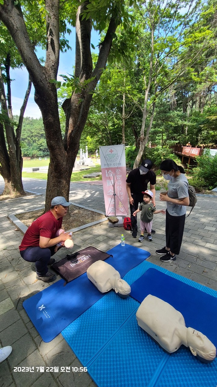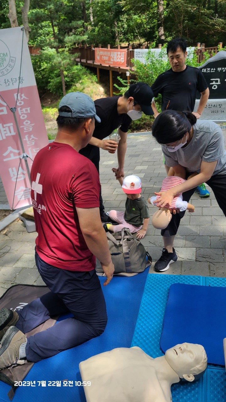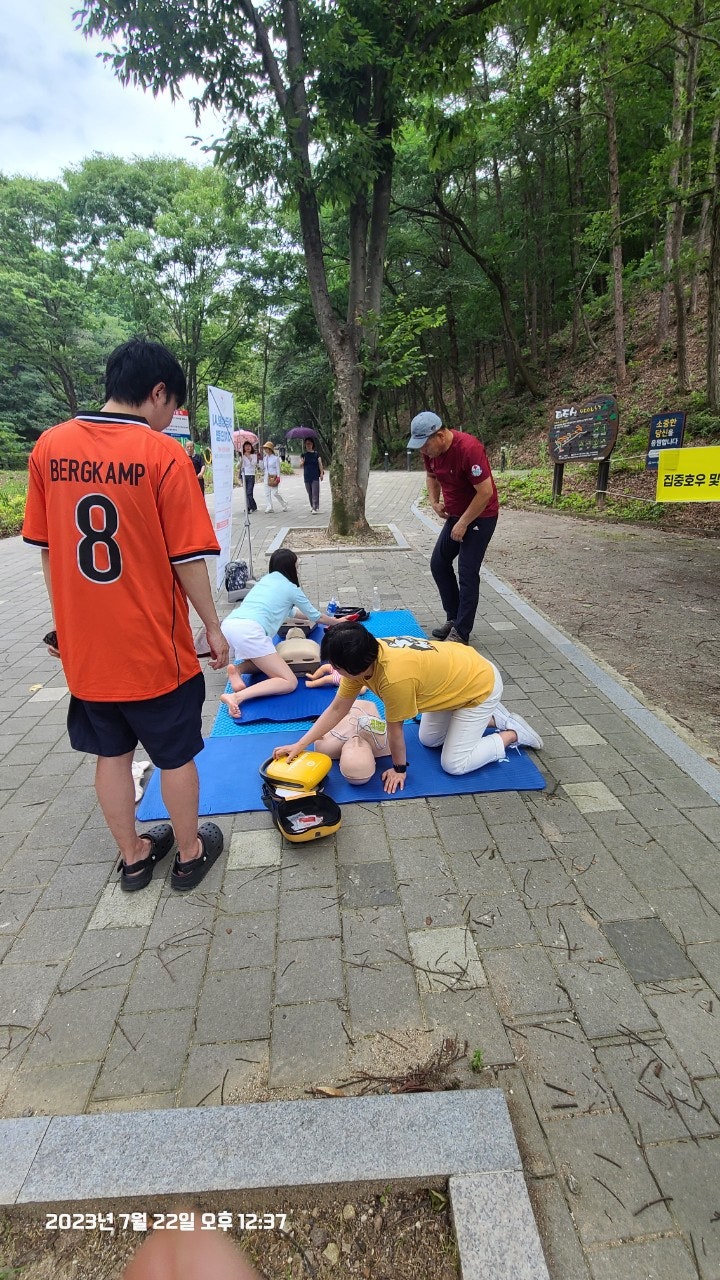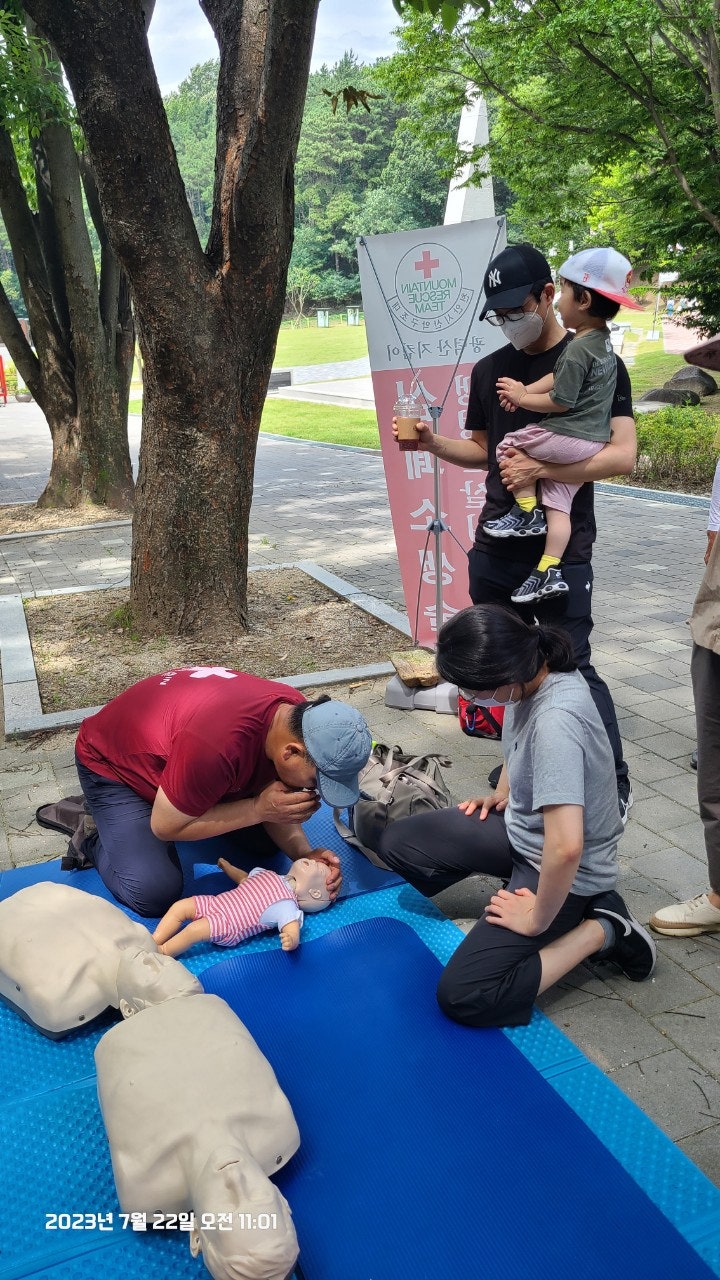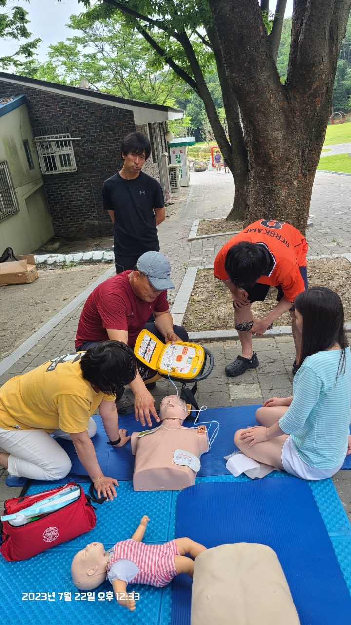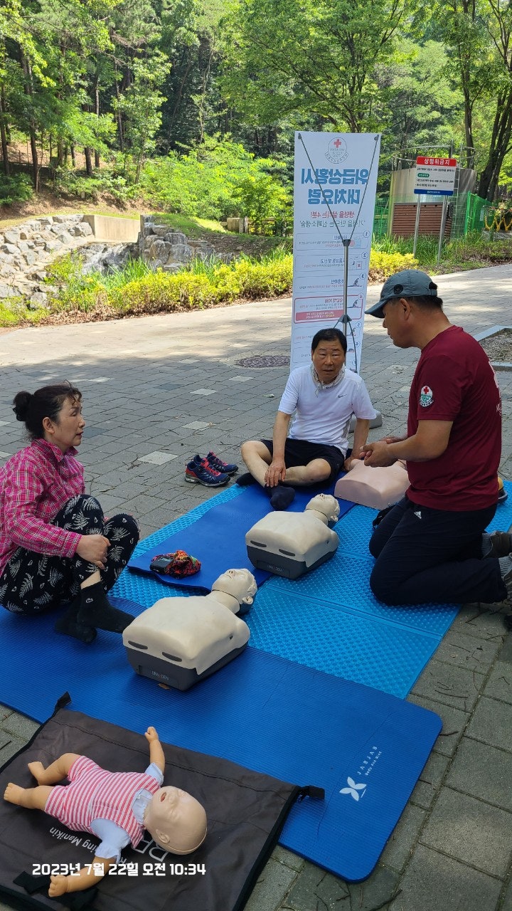 활동상황 제목토요일 태조산 응급처치 활동2023-07-23 08:31작성자kskang토요일 태조산 응급처치 활동날짜 : 2023년 7월 22일 토요일, 맑음시간 : 08시 00분 ~13시 00분참석자 : 최성이 고문님, 이연우 대원님, 고상배 대원님, 진홍석 대원-활동내용-☆태조산 정화활동- 태조산 안전체험관쪽으로 올라 태조산에 올라 형제봉을 지나 대머리봉으로 해서 정화활동했습니다.태조산 등산로에는 쓰레기가 없었으나 등산로를 벗어나 양옆으로 버려진 쓰레기가 많았습니다.대머리봉으로 가는길에 큰 나무가 쓰러졌습니다. 때마침 정자밑에 톱이 있어서 나무를 자르고 양옆으로 치웠습니다.태조산도 구조대가 접수했습니다^^☆심폐소생술 교육태조산 관리사무소 뒤편 그늘에 자리를 잡았습니다. 준비하자마자 노부부께서 관심을 보이셨습니다.진지한 모습으로 최성이 고문님 말씀을 듣고 계십니다.설명에 이어 실습중이십니다.'오늘 태조산에 오길 잘했다'하시면서 가셨습니다. 다음은 28개월 아이와 함께 온 부부였습니다. 토요일, 휴일이어서인지 가족단위로 많이 오셨습니다.이번에도 최성이 고문님이 담당하셨습니다.오늘 모든 교육 및 실습을 하셨습니다.아이와 함께와서 아이엄마가 교육을 받았습니다.실제처럼 연습하셨습니다.실습하면서 궁금한 사항을 물어보고 이해하고 다시 실습 했습니다.고문님 고생많으셨습니다.맨 우측에 있으신 분은 가족중에 심장마비로 돌아가신분이 있어 '내 가족중에도 발생할수 있다'시면서 열심히 실습하셨습니다.자동심장충격기도 애니에 붙이면서 진지하게, 실제처럼 하셨습니다.노부부와 여성분이 마지막으로 교육을 받으셨습니다.이렇게해서 태조산에서의 정화 활동 및 심폐소생술 교육을 마무리했습니다.최성이 고문님만 교육을 하셔서 정말 죄송한 마음이었습니다.더운 날씨에 수고 많으셨습니다.6월에 응급처치 교육도 받았고, 구조대내에서도 여러차례 교육을 받았지만 아직은 많이 부족함을 느낍니다.많이 배워서 저도 한몫하는 그날이 왔으면 좋겠습니다.태조산에서 일정이 끝나고 최성이 고문님이 시원한 물냉면과 맛있는 전병을 사주셨습니다. 그리고 구조대가 앞으로 해야할일 등 많은 얘기를 해주셨습니다. 감사합니다.다음에도 참여해서 한걸음 더 발전하도록 노력하겠습니다. 오늘 참여하신 분들 수고하셨습니다.즐거운 주말 보내시길바랍니다. 목록 댓글 [0] 더보기이전2023년 7월 16일 근무일지 -kskang2023-07-23다음- 2023년 6월 25일 근무일지 -kskang2023-06-26 Powered by MangBoard