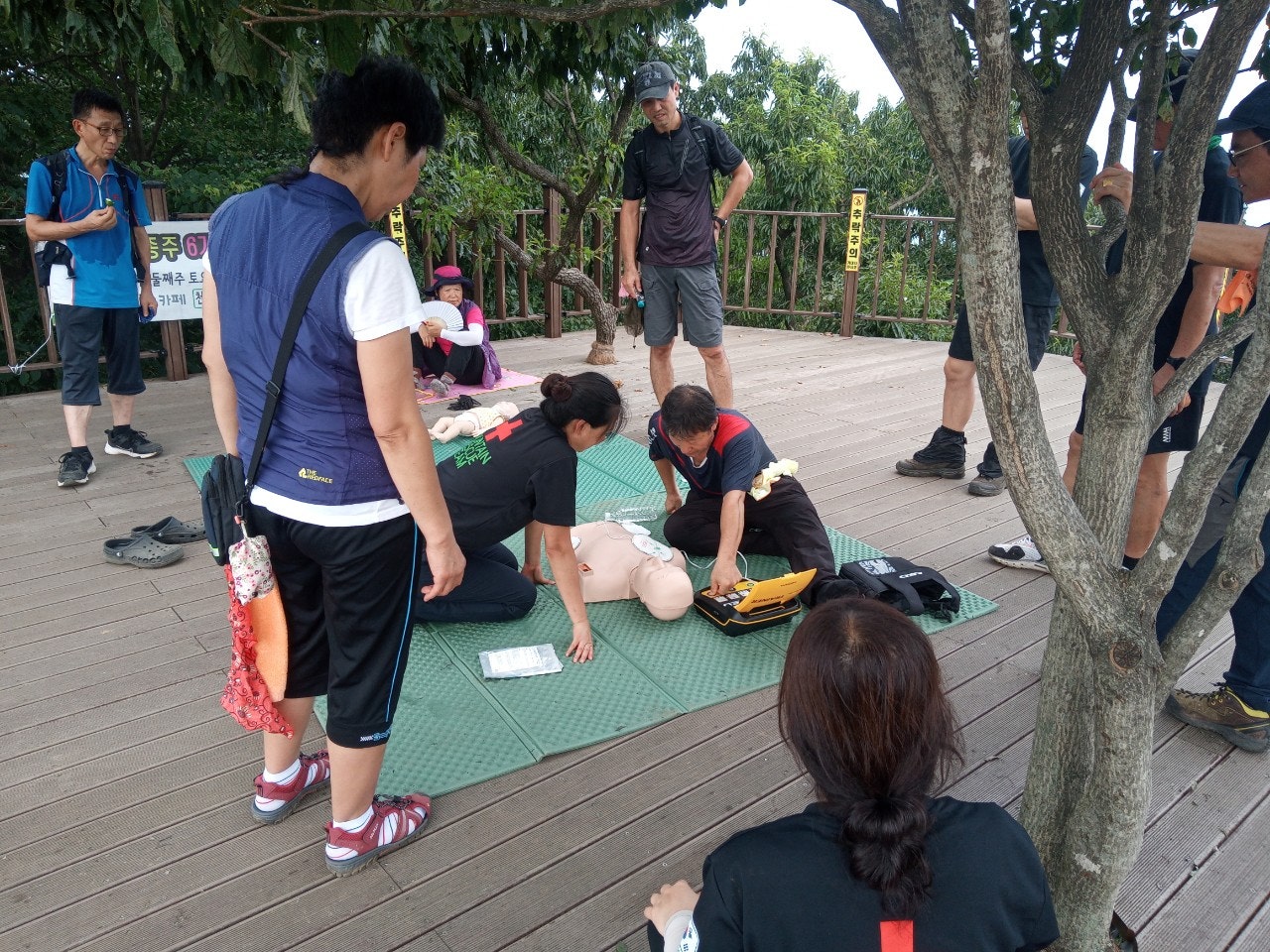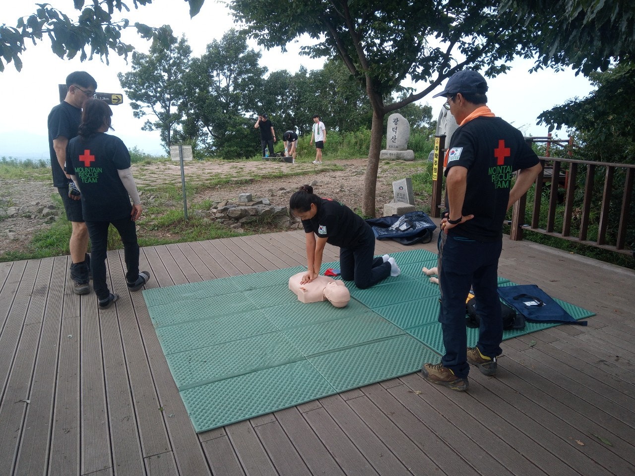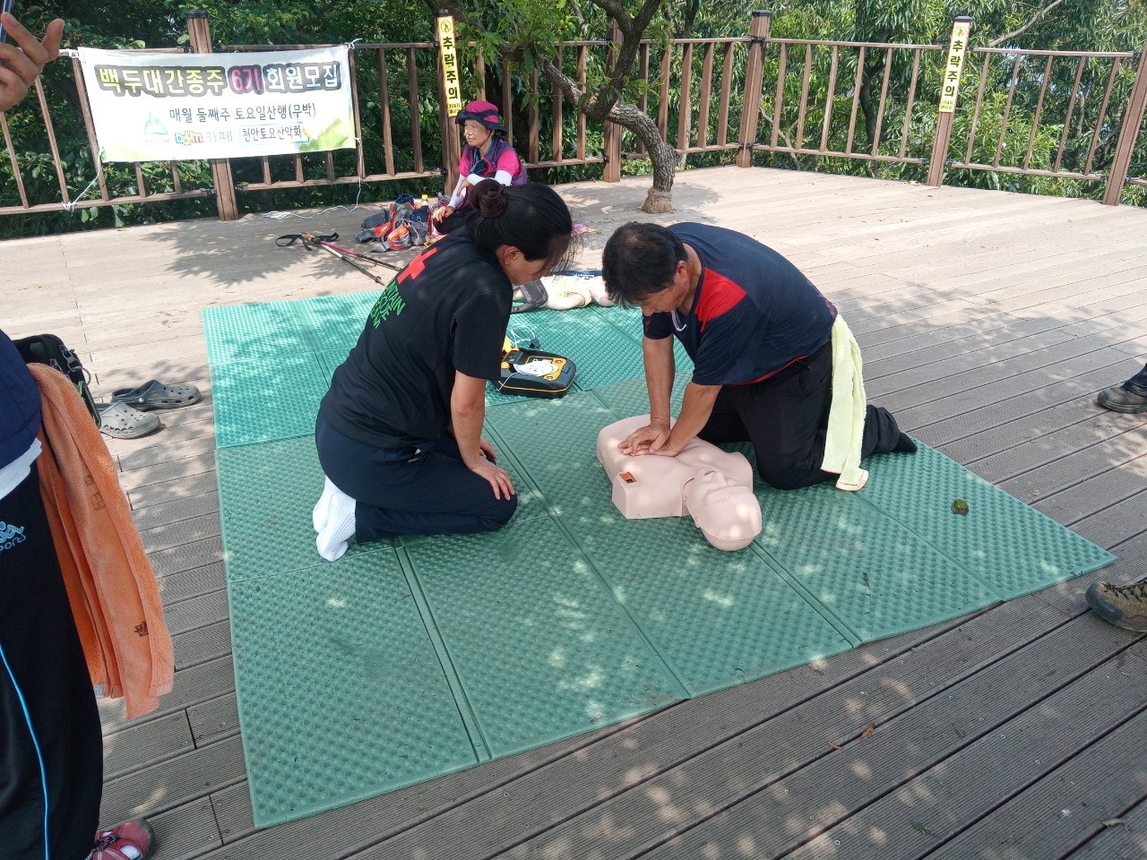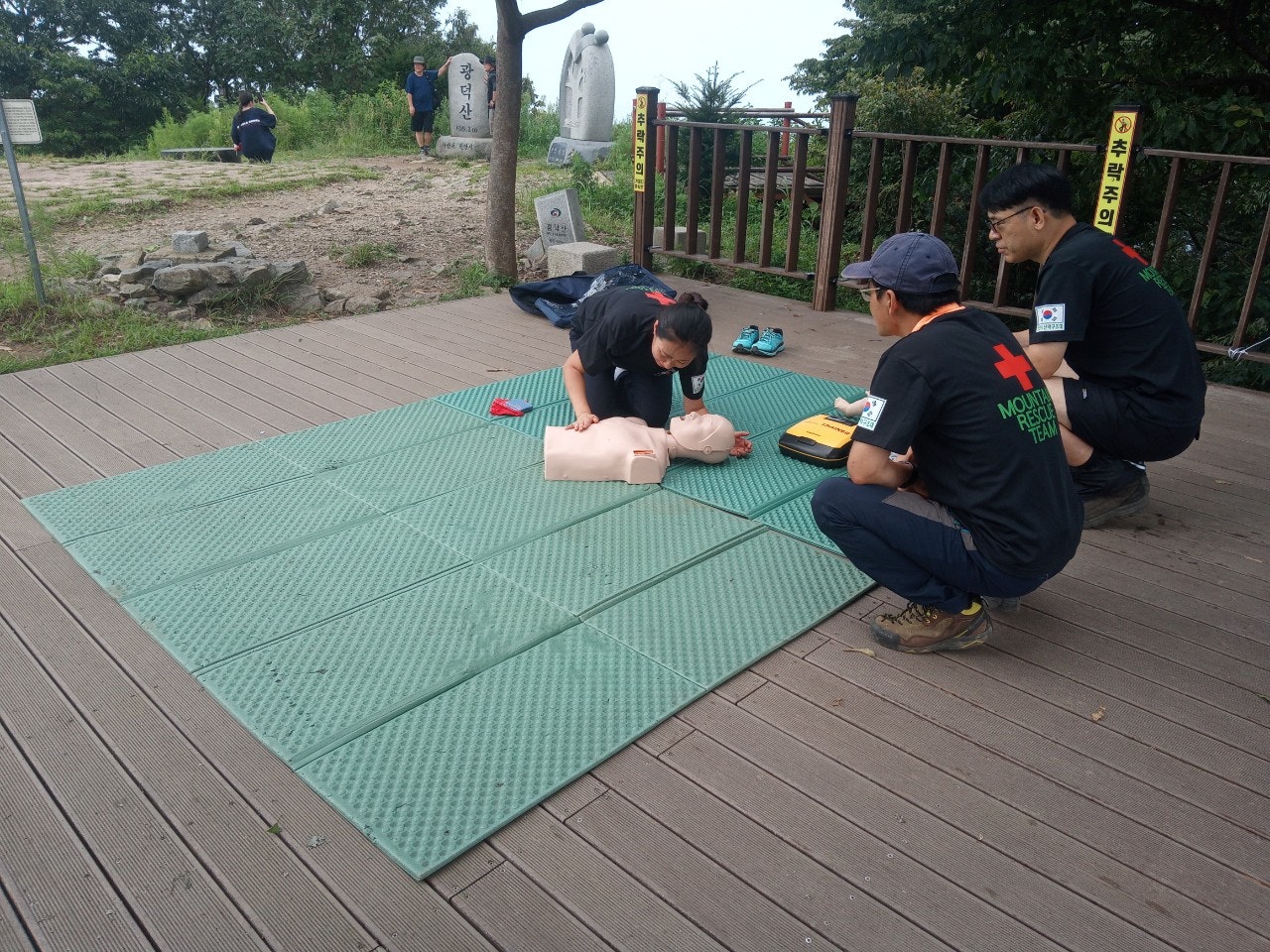 - 정상초소옆 데크에서 등산객대상으로 응급처치교육(윤동자 대원님)- 심폐소생술 교육, AED사용법 교육