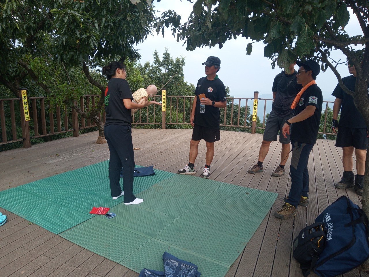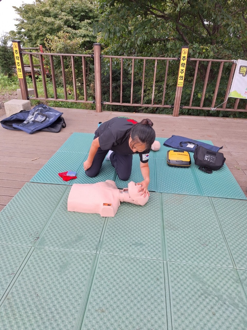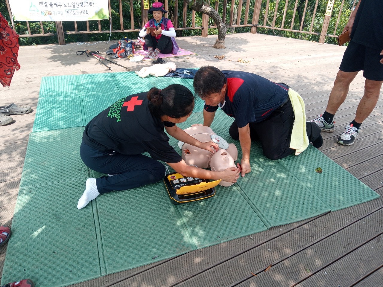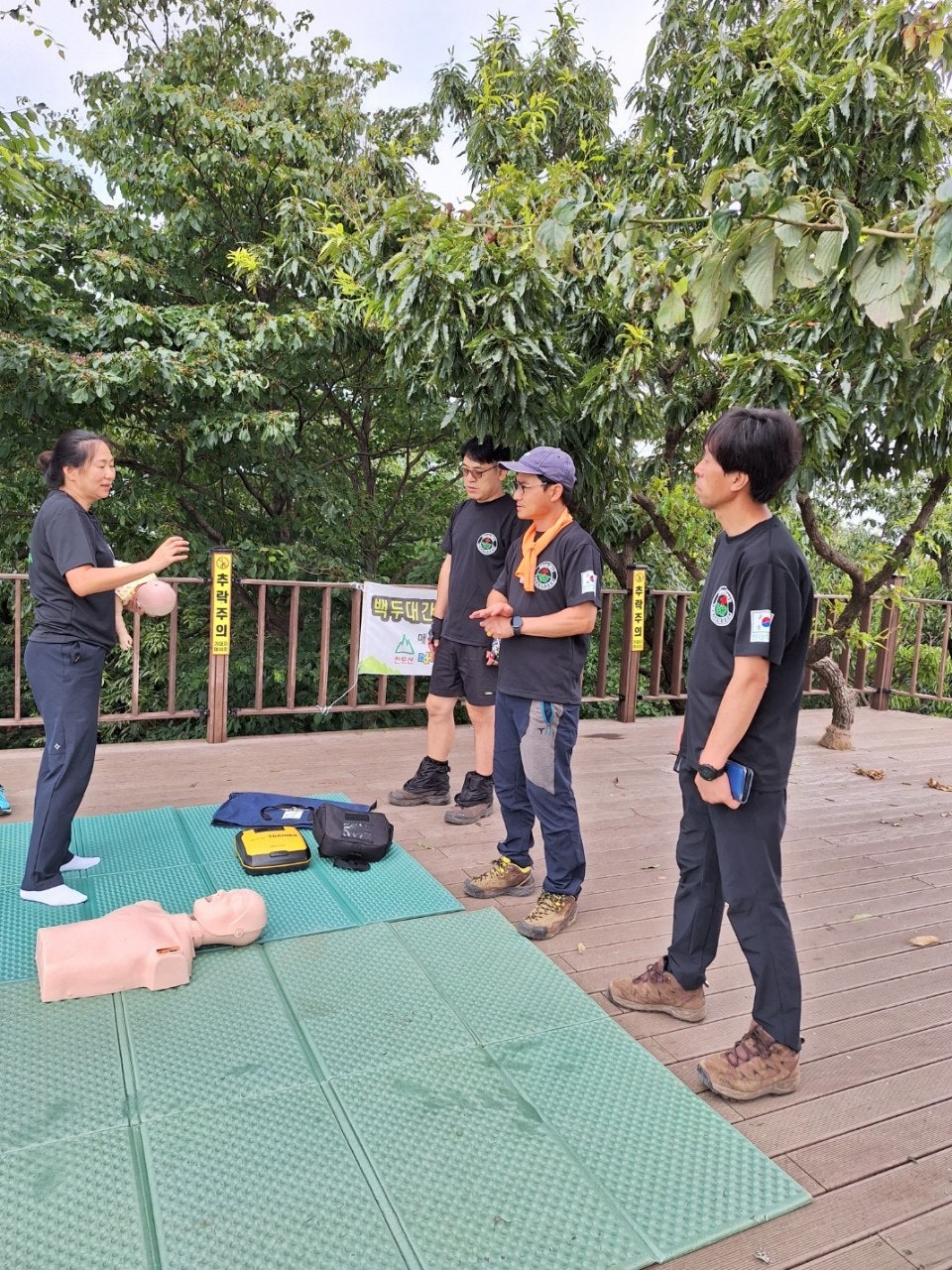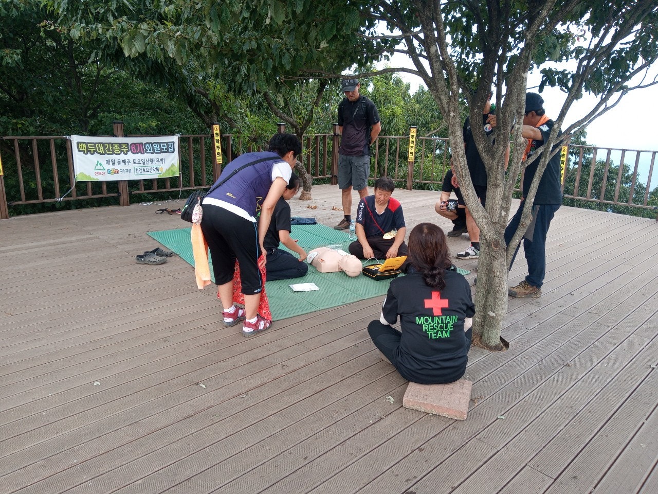 - 정상초소옆 데크에서 등산객대상으로 응급처치교육(윤동자 대원님)- 심폐소생술 교육, AED사용법 교육