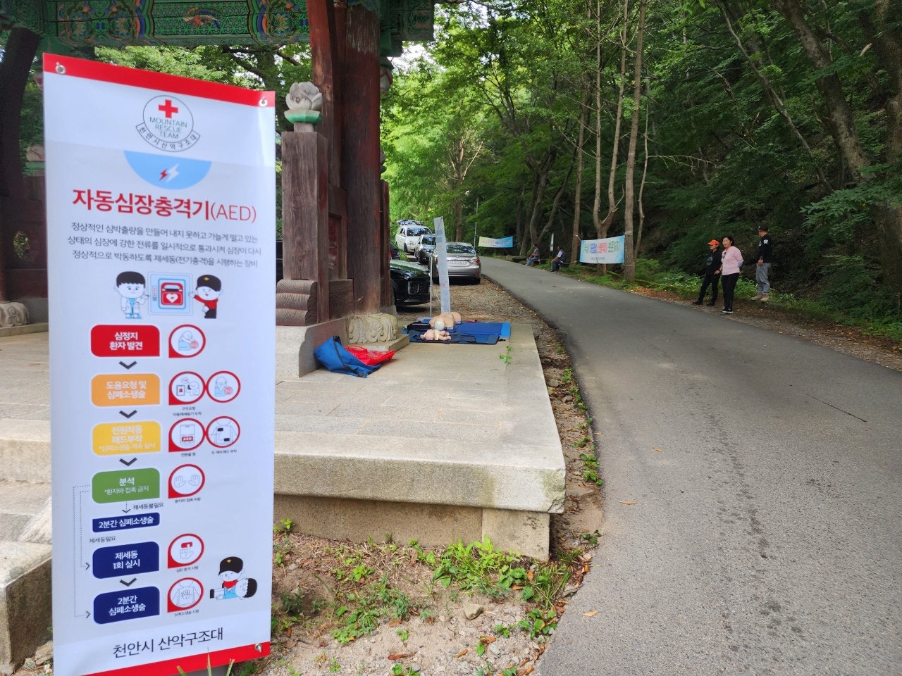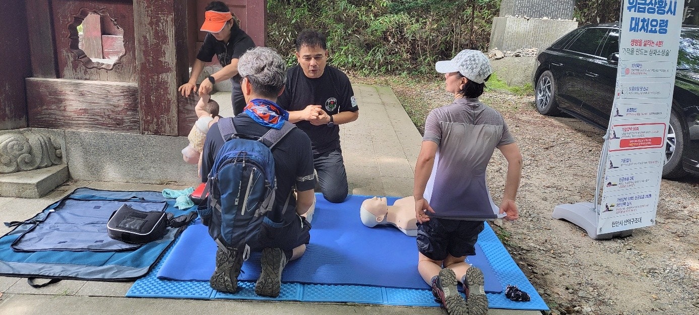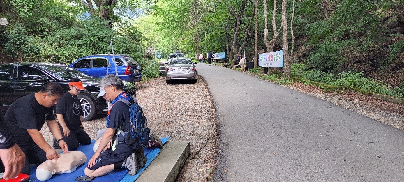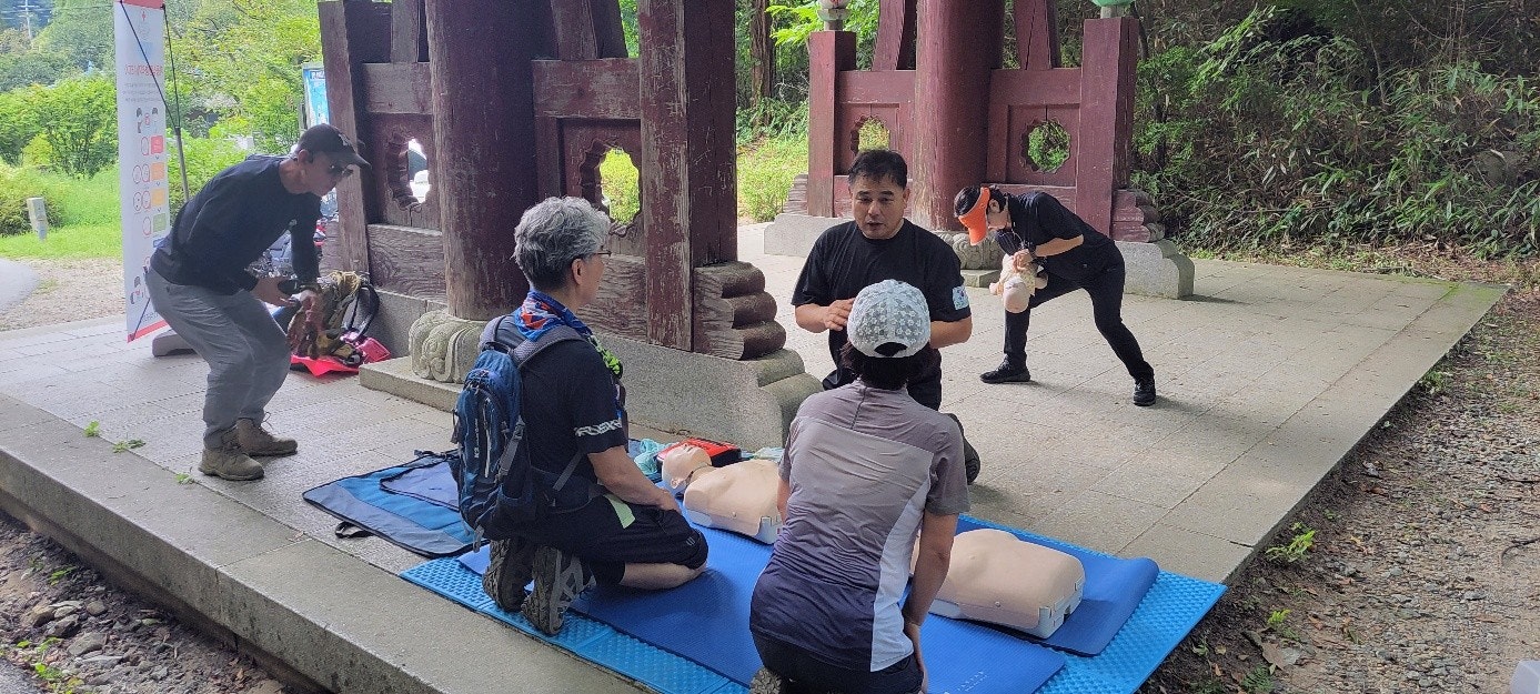 2. 일주문 앞 응급처치 활동(최성이고문님) : 광덕산 산행 및 탐방객 대상으로 심폐소생술 교육