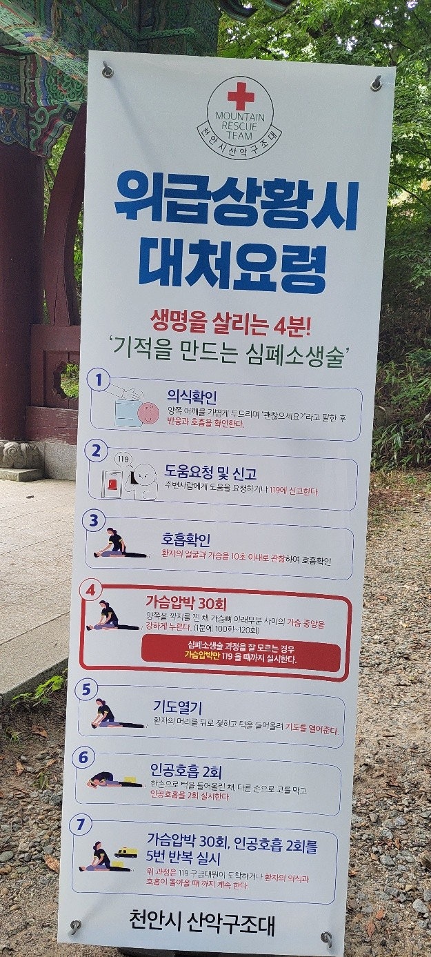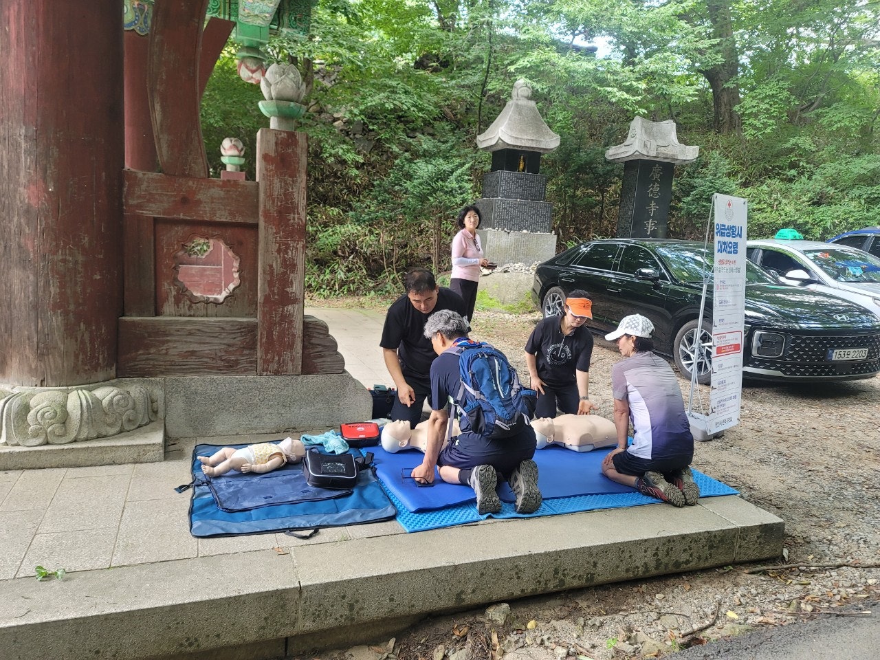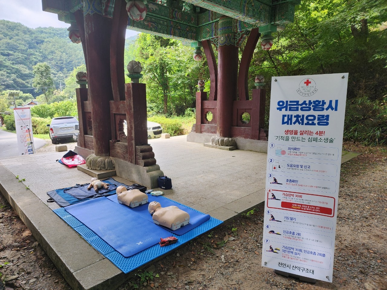 2. 일주문 앞 응급처치 활동(최성이고문님) : 광덕산 산행 및 탐방객 대상으로 심폐소생술 교육