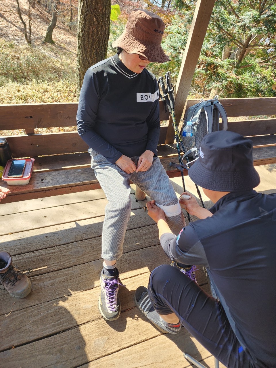 연세가 있으신 등산객이 무릎이 불편하시다고 찾아오셔서 압박붕대로 조치해 드렸습니다