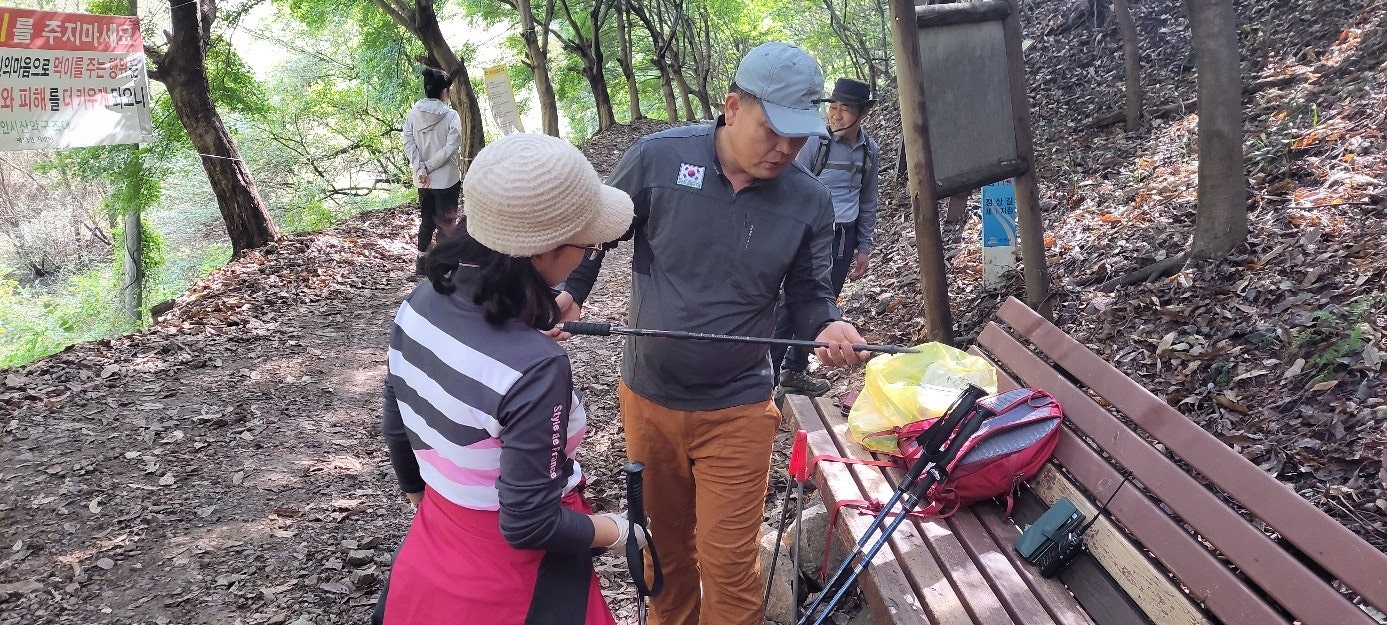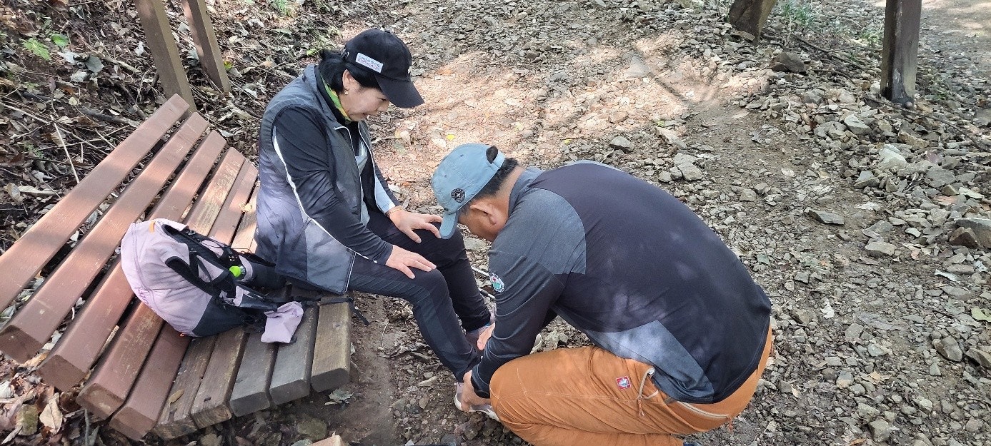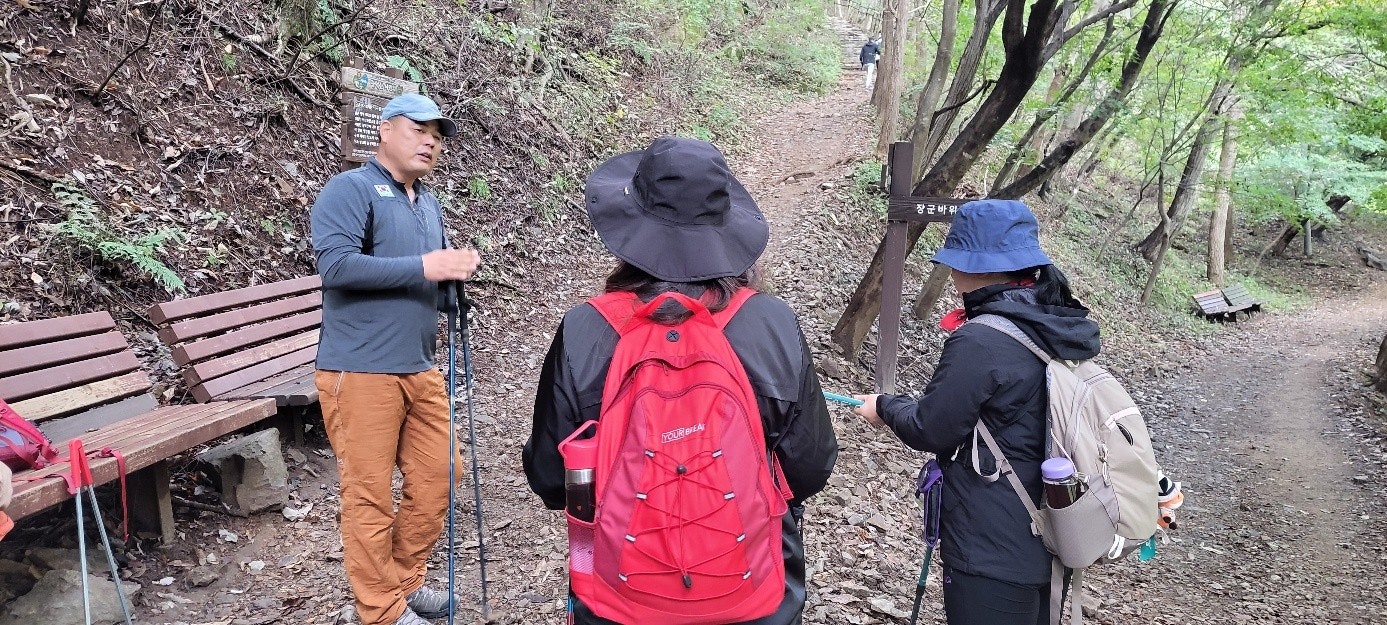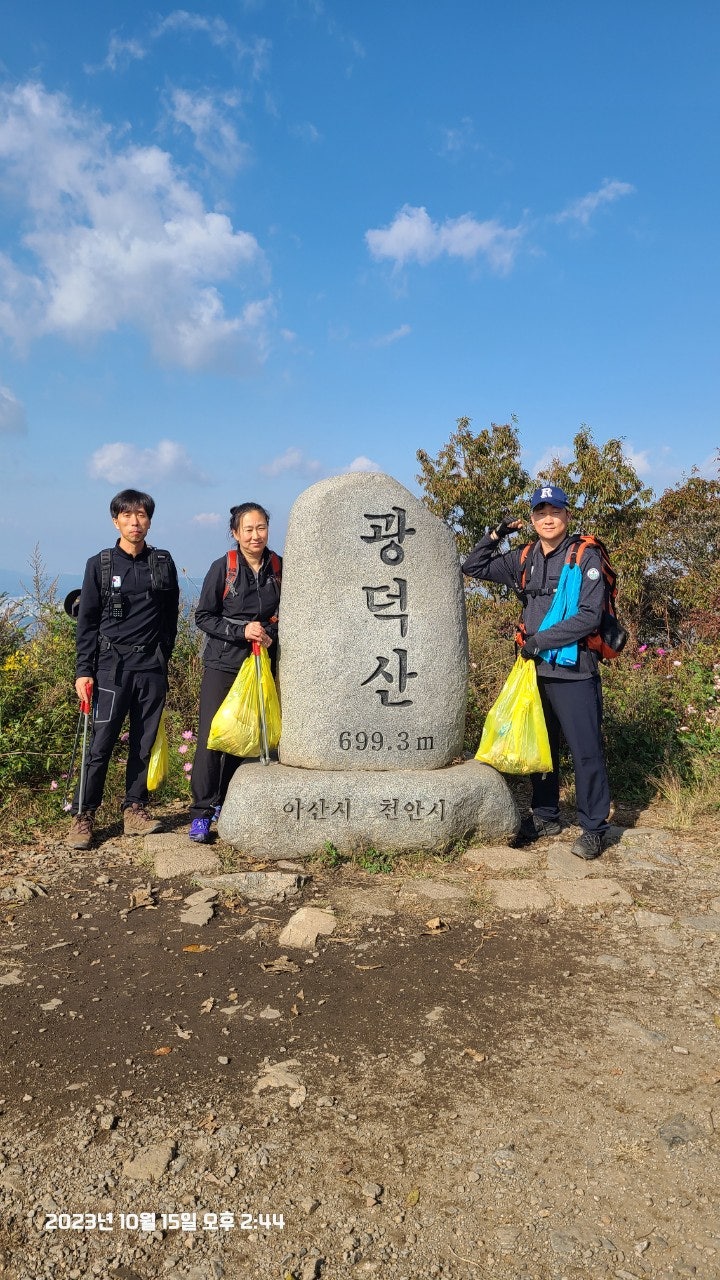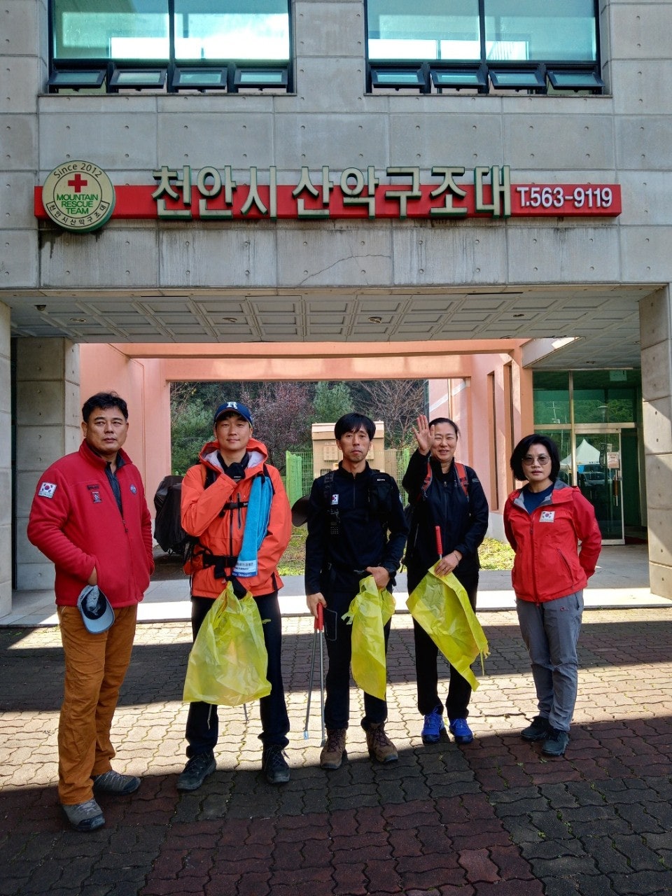 사무실 도착후 소방서 연락후 다같이 모여 사진찍습니다. 최성이 고문님, 박용운 감사님, 김경숙 대원은 광덕사 일주문 및 정상과 장군바위 갈림길에서 등산객 상대로 등산화 끈 묶는 방법, 올바른 스틱 사용 방법, 등산시 보행법등을 교육하셨습니다.
