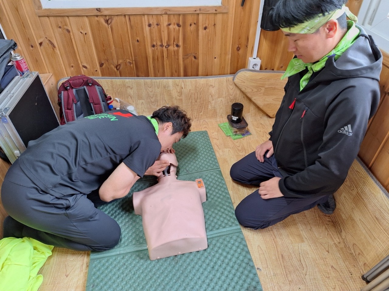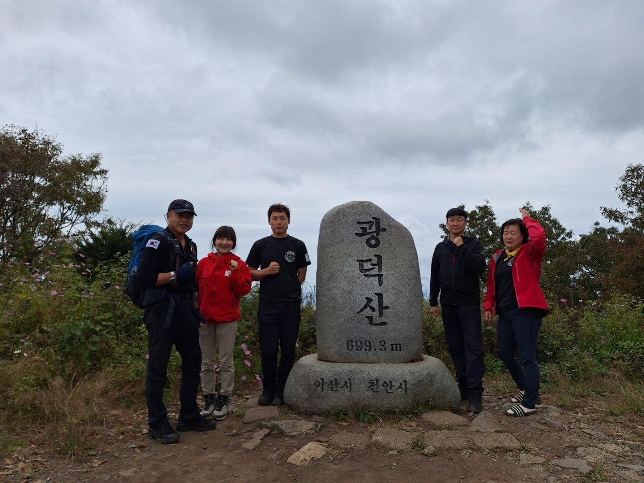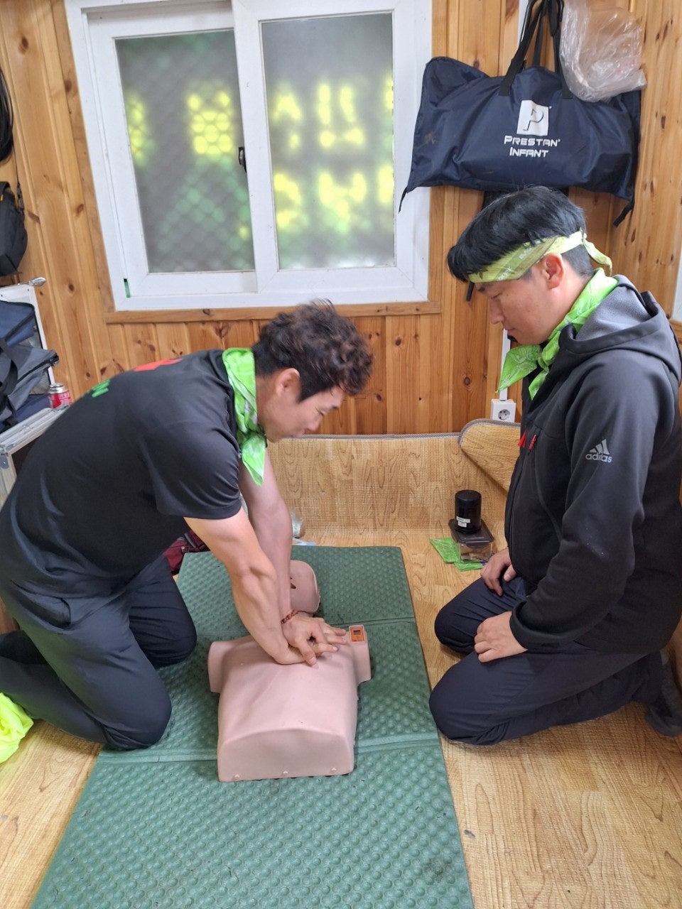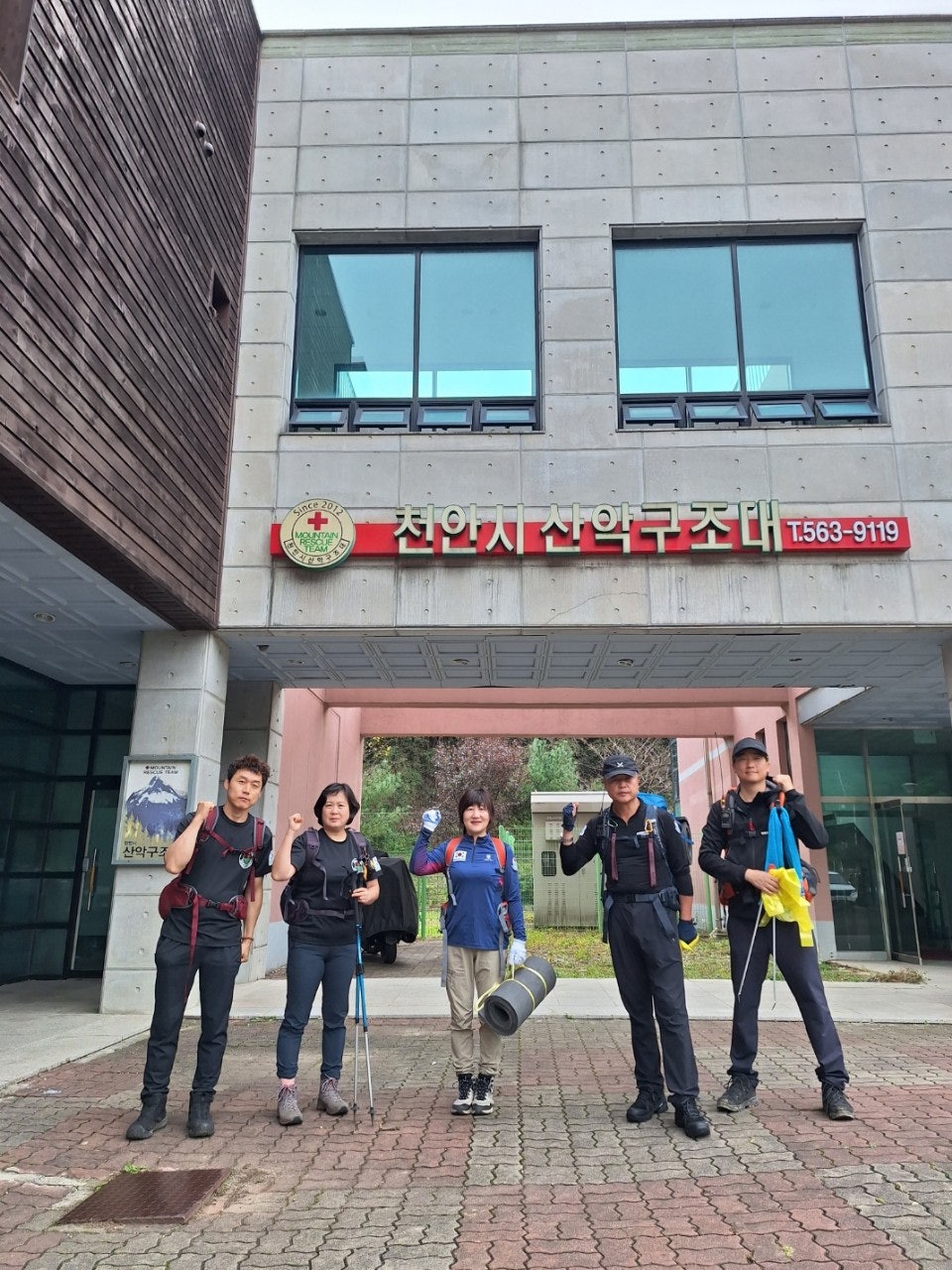활동상황 제목천안시 산악구조대 근무일지 날짜 10월 8일 일요일2023-10-31 09:53작성자kskang천안시 산악구조대 근무일지날짜 10월 8일 일요일날씨 흐렸던 날씨근무자 김상균 감사님, 김태화 운영위원님, 전난희 팀장님, 김연우, 허기영, 진홍석 대원사진은 김상균 감사님이 찍어주셨습니다.이러고보니 독수리 5형제였습니다^^소방서에 보고후 사진찍고 정상을 향해 출발합니다.김상균 감사님은 사무실에서 무전기 수신감도 테스트 및 현장대기 하셨습니다.모두 즐거운 마음으로 오릅니다.매주 정화활동을 해서그런지 이번주는 깨끗했습니다.인간 다람쥐처럼 정말 빠르십니다^^정상을 오르는 중에 사무실에 대기하고 계신 김상균 감사님과 무전 수신테스트를 계속 하면서 올랐습니다.저번주에 이어 이번주에도 정상 초소를 따뜻하게 하기위해 허기영 대원이 수고해주셨습니다.초소 바닥은 마무리되었습니다.엉덩이 떼기 힘듭니다.또한 전기히터도 설치를 완료했습니다.추운 겨울 초소 대기함에있어 안전하게 있을것 같습니다. 다시한번 감사드립니다.그리고 점심시간즈음 박주열고문님이 정상에 오셨습니다. 추모식이 있어 오신김에 초소에 방문하셔서 인사도 하고 약간의 담소도 나눴습니다.그리고 가시면서 허기영대원이 들고있는 스카프 5장을 주고 가셨습니다.산행시 유용한 내용이어서 찍어봤습니다.이연우 대원의 아이디어인데, '저희도 광덕산 지도를 배경으로 제작을해서 산행객에게 나누어줘서 조난시 위치확인을 할수 있음과 동시에 저희 산악구조대도 알릴수 있는 기회가 되지 않을까' 싶다는 의견이 있었습니다.점심 해결후 심폐소생술 연습을 좀 더 해봤습니다. 오늘 오전에 비가 조금 내렸고, 쌀쌀한 날씨여서 초소 내부에서 실시 했습니다.광덕산 정상입니다^^코스모스가 이쁘게 피었습니다.심폐소생술 연습도 하고 오늘의 일정을 마무리 합니다.하산완료후도솔암장에서 복귀하신 김상균 감사님이 사주신 커피와 호두과자를 먹으면서 앞으로 산악구조대가 해야할 일 등 자유로운 분위기 속에서 의견교환도하고 즐거운 시간 보내며 금일 구조대 활동 마무리 했습니다. 피로가 싹 풀렸습니다^^☆전달사항초소에 물 500ml 4개정도 있습니다.초소 및 사무실에 커피 없습니다.물티슈는 확인하지 못했습니다.(있는지 없는지 모르겠습니다)초소에 오르셔서 바닥 장판 및 벽에 달린 히터 사용후 코드 뽑아주시기 바랍니다.다음주에 사무실 앞 주차장에서 광덕산 호두축제가 13일에서 15일까지 있습니다. 주차 잘 하시기 바랍니다. 목록 댓글 [0] 더보기이전근무일지 2023. 10. 01kskang2023-10-31다음2023. 10.15 근무일지kskang2023-10-31 Powered by MangBoard