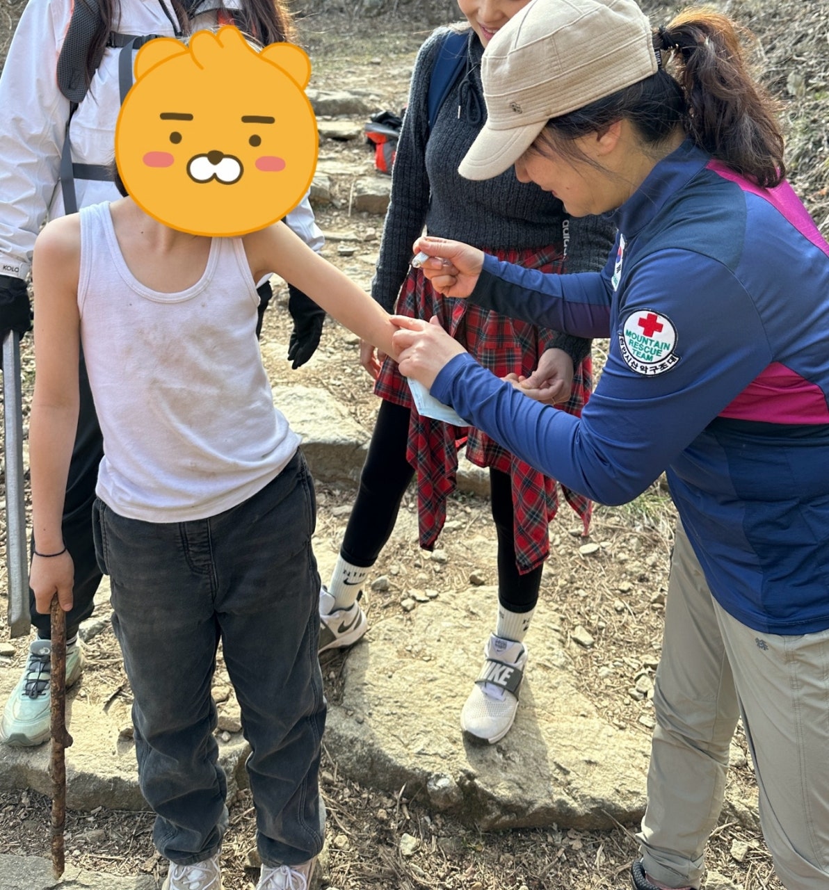 박씨샘 지나고 내리막길에서 5살 어린아이 상처 치료 해주고